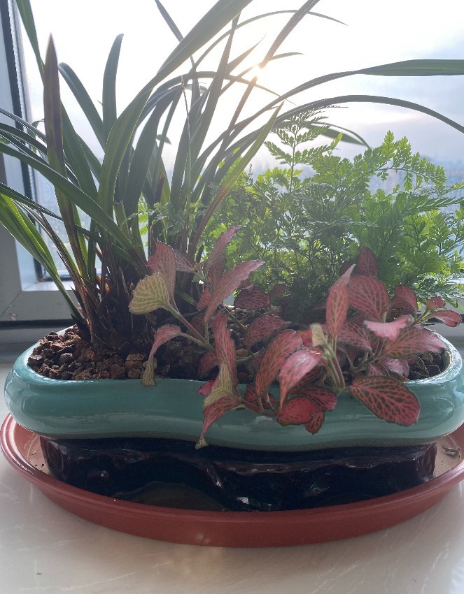 小盆景——(左侧墨兰,红色是网纹草,右侧骨碎补)